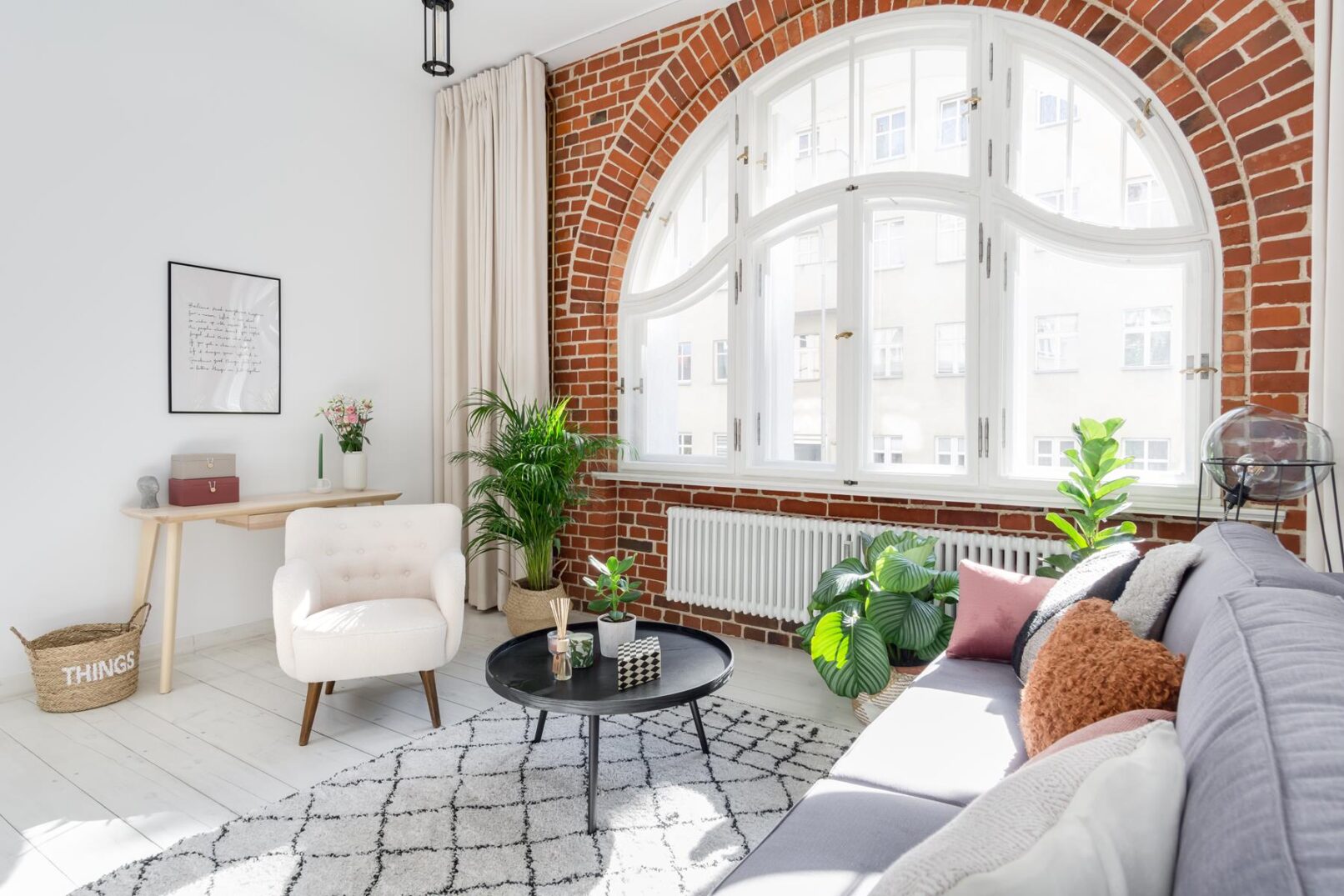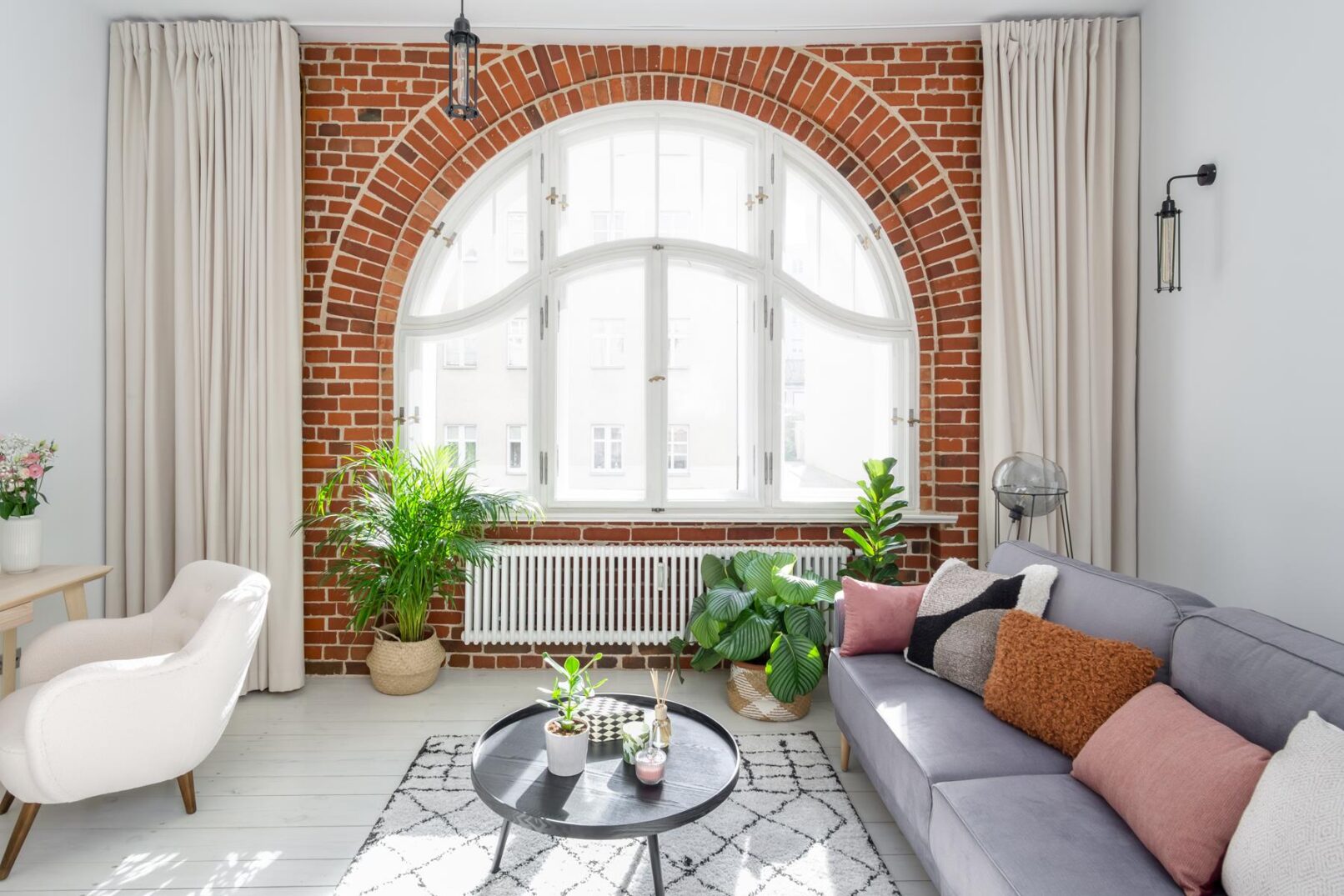 Decyzja o odsłonięciu łuku z cegły nad oknem sprawiła, że to ono nadało ton całemu wnętrzu. Okno w otoczeniu czerwonej cegłyz jednej strony przywołuje na myśl wnętrza nowojorskie, ale równie dobrze mogłoby znajdować się w Sztokholmie. Cegła we wnętrzu kontrastuje z bielą ścian i podłóg i stanowi idealne tło dla bujnej roślinności we wnętrzu, jak na prawdziwą miejską dżunglę przystało.