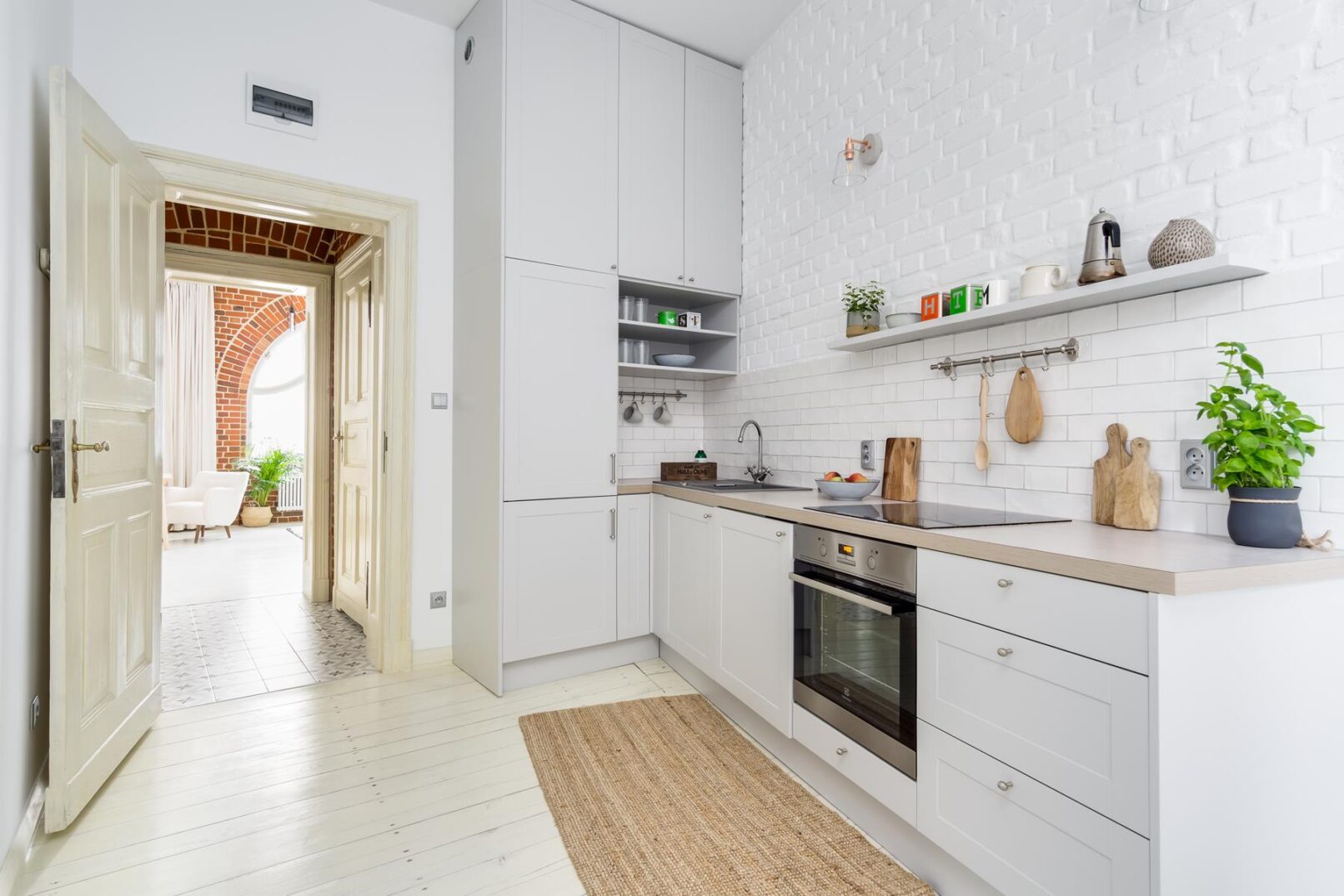 Kuchnia ma bardzo nietypowy kształt, w szerszej części znalazło się miejsce na sporą zabudowę kuchenną pod wymiar, w węższej stanął wiekowy, okrągły stół. Wnęka w najwęższym miejscu pomieszczenia powstała po zamurowaniu drzwi do drugiej części mieszkania i służy teraz jako regał, który nie zajmuje miejsca. Oryginalna cegła, tym razem pomalowana na biało, nadaje ciekawą fakturę długiej ścianie w kuchni. Neutralne barwy zastosowane w kuchni stanowią idealne tło dla roślin, które opanowały to pomieszczenie.