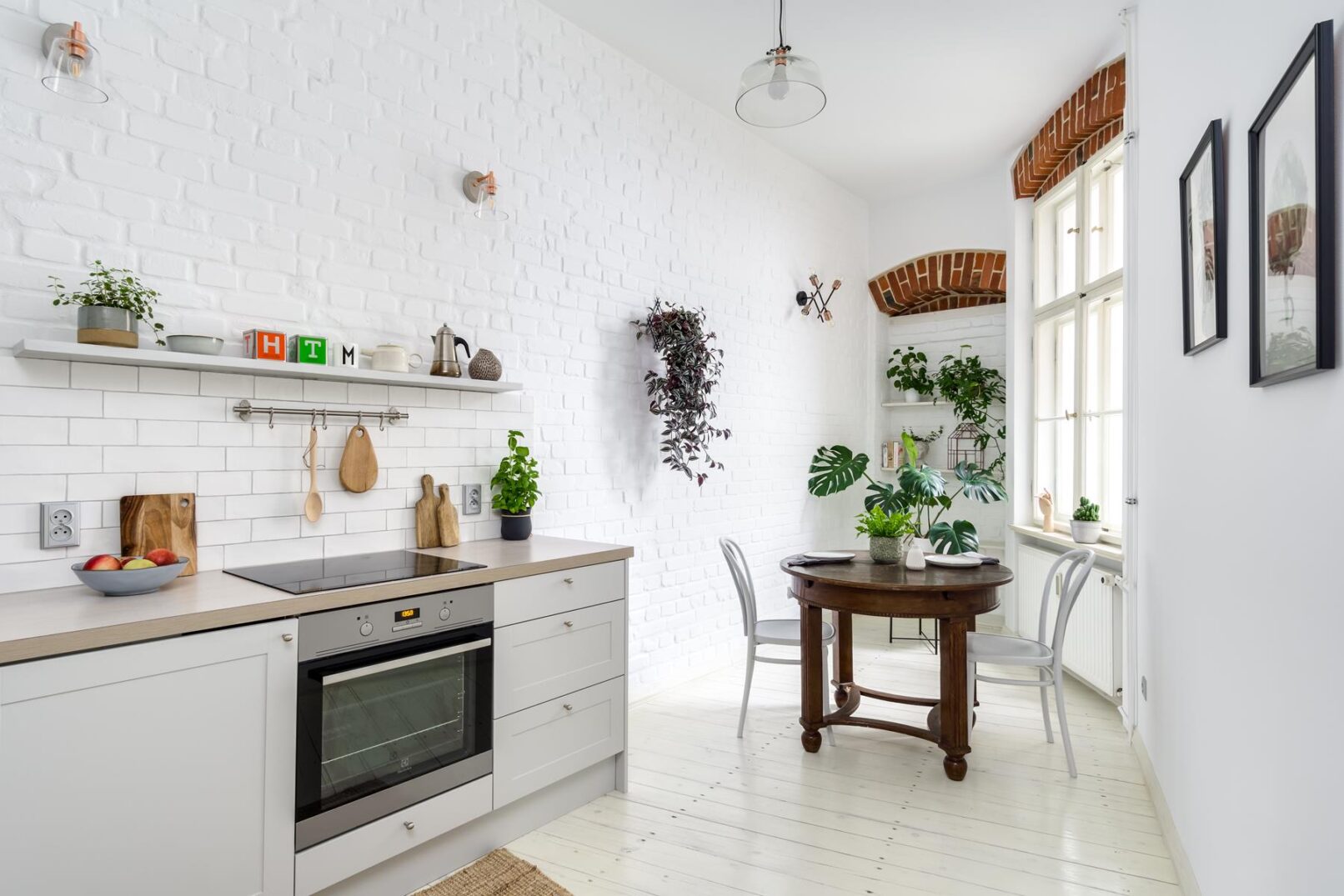 Kuchnia ma bardzo nietypowy kształt, w szerszej części znalazło się miejsce na sporą zabudowę kuchenną pod wymiar, w węższej stanął wiekowy, okrągły stół. Wnęka w najwęższym miejscu pomieszczenia powstała po zamurowaniu drzwi do drugiej części mieszkania i służy teraz jako regał, który nie zajmuje miejsca. Oryginalna cegła, tym razem pomalowana na biało, nadaje ciekawą fakturę długiej ścianie w kuchni. Neutralne barwy zastosowane w kuchni stanowią idealne tło dla roślin, które opanowały to pomieszczenie.