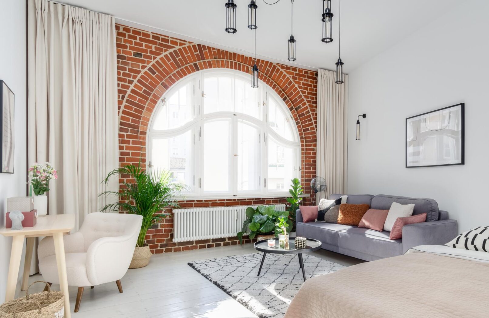 Decyzja o odsłonięciu łuku z cegły nad oknem sprawiła, że to ono nadało ton całemu wnętrzu. Okno w otoczeniu czerwonej cegłyz jednej strony przywołuje na myśl wnętrza nowojorskie, ale równie dobrze mogłoby znajdować się w Sztokholmie. Cegła we wnętrzu kontrastuje z bielą ścian i podłóg i stanowi idealne tło dla bujnej roślinności we wnętrzu, jak na prawdziwą miejską dżunglę przystało.